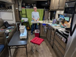 Off to Ace Hardware for plumbing bits, then repair the sink (more contortions). Debbi helped by holding the piping while I sawed it to length, then I set it in place. I’ll have to get on the roof to see if a clogged gutter is letting air conditioning condensate drip down the side of the Goose and into the cargo compartment. Oh well, back to dumping black and gray tanks, which was interrupted by the GFCI thing.