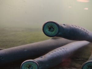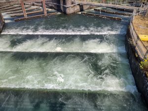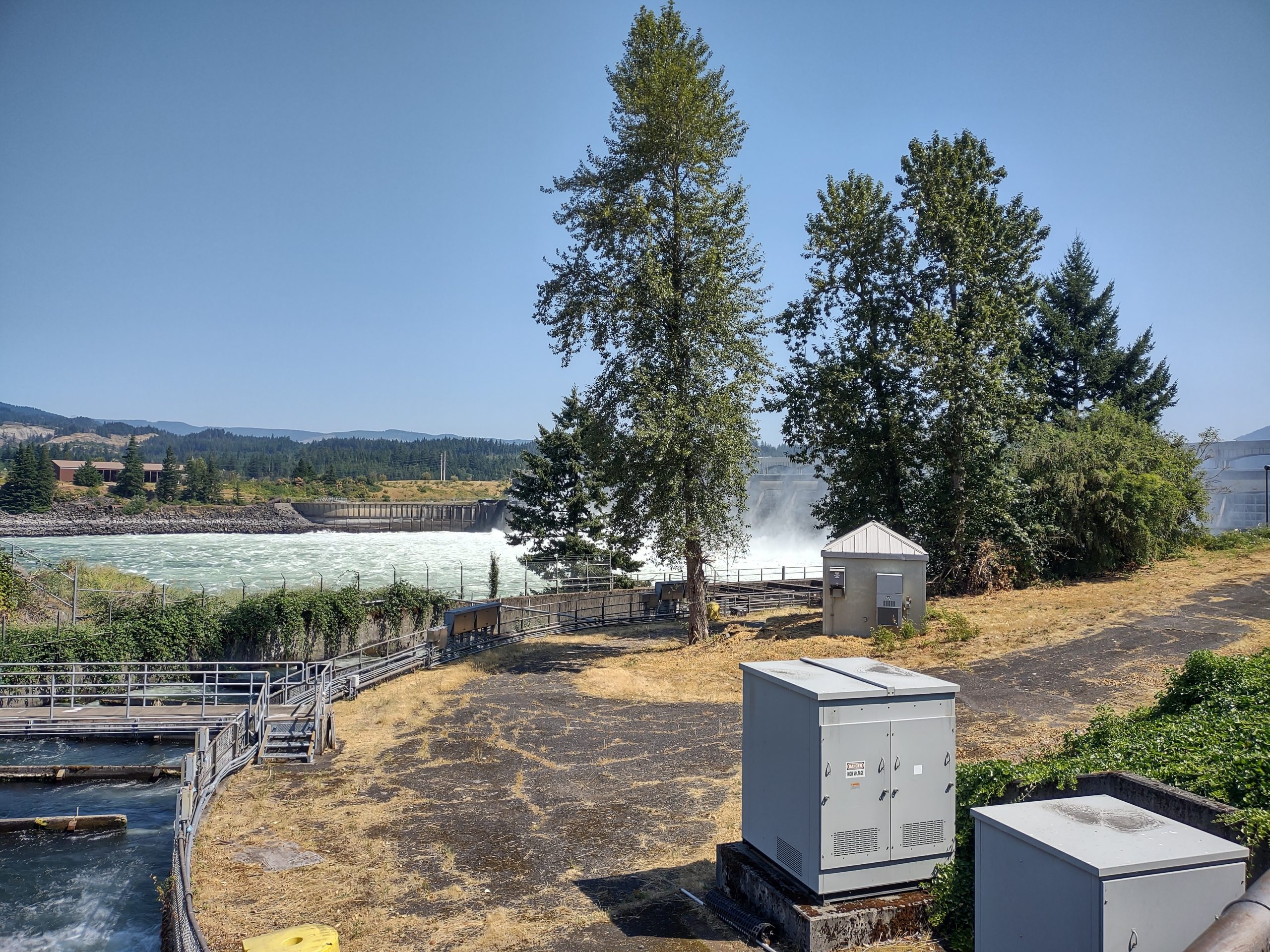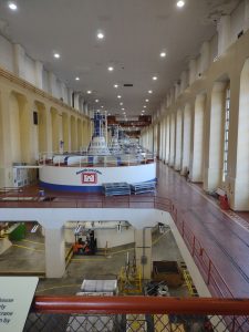 We went down to level one, then walked over to the number 1 power station dam.  What you see in the powerhouse is the electrical part of the power turbines.  Below the stator/ rotor are the turbine blades turned by water falling from the dam lake to the output.  The turbines, refurbished relatively recently in the dam’s history, now have adjustable pitch propellers with variable geometry blades.  This took Jim back to his Navy days designing props and working in shipyards!  The new designs have improved the through-turbine fish survival rate into the mid 90% range.