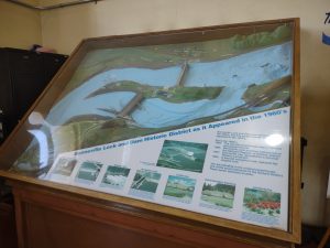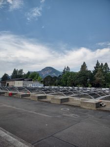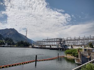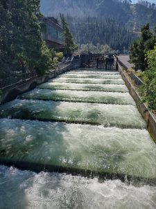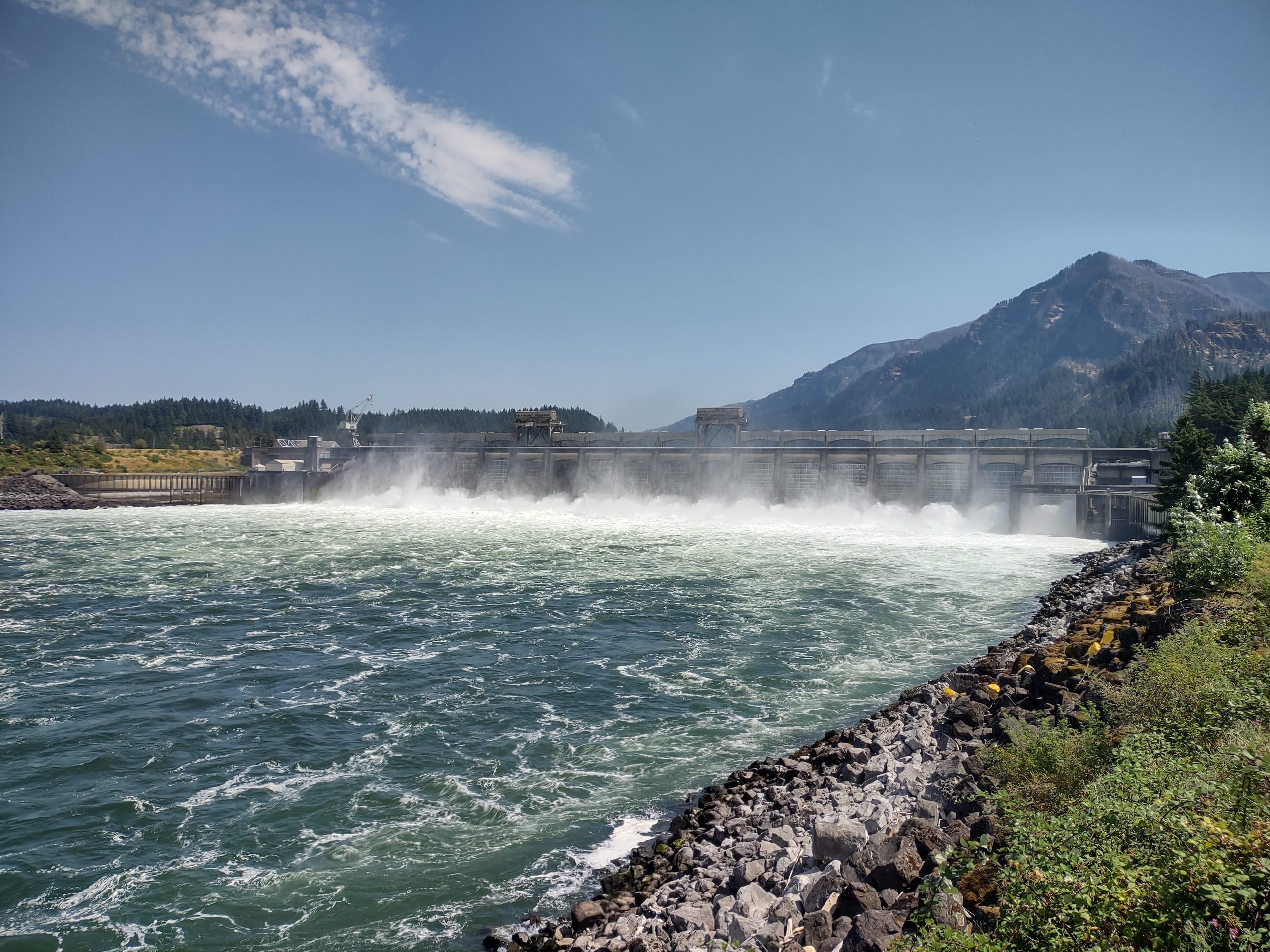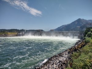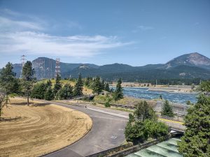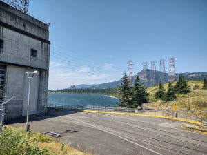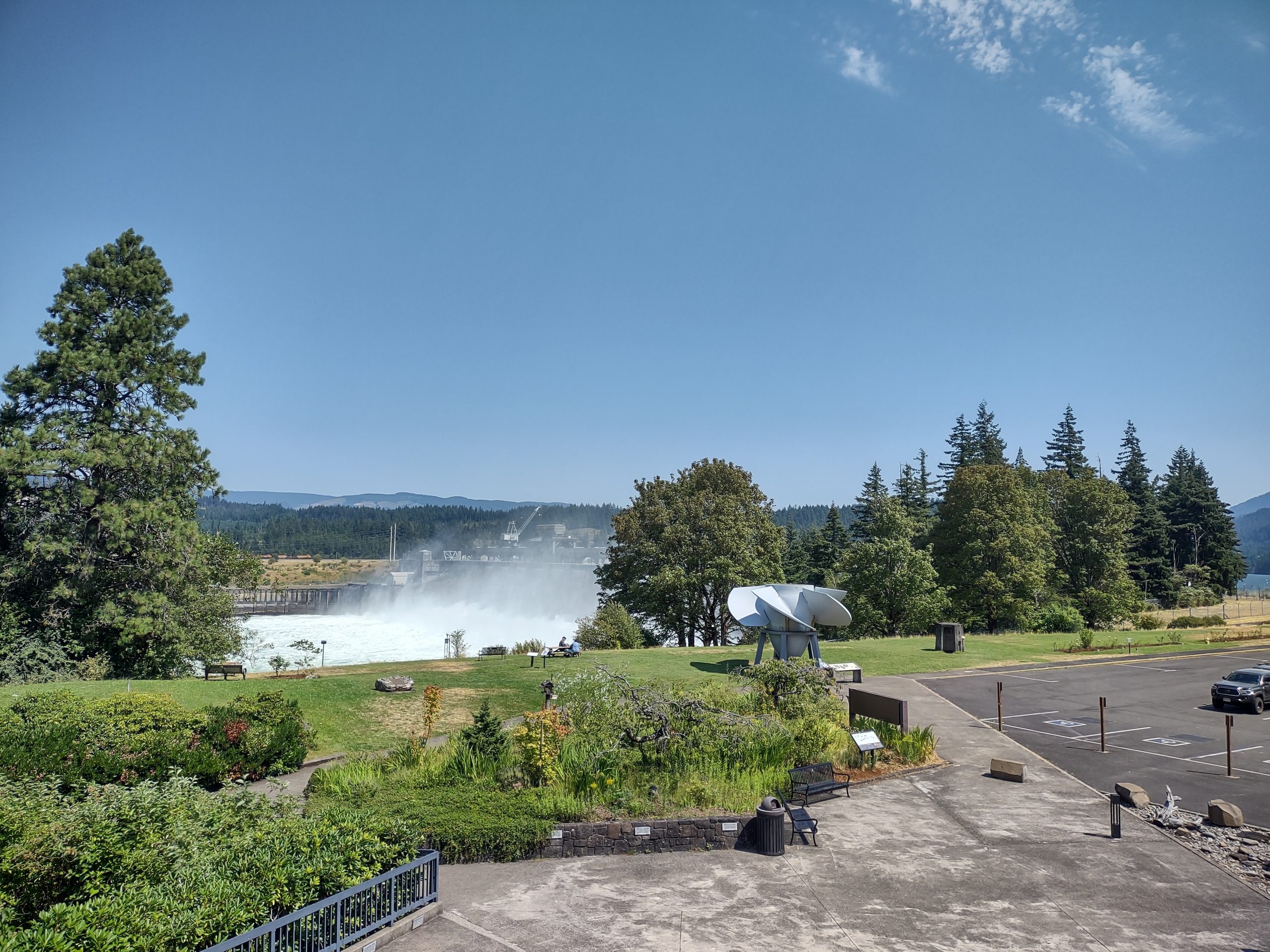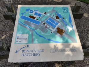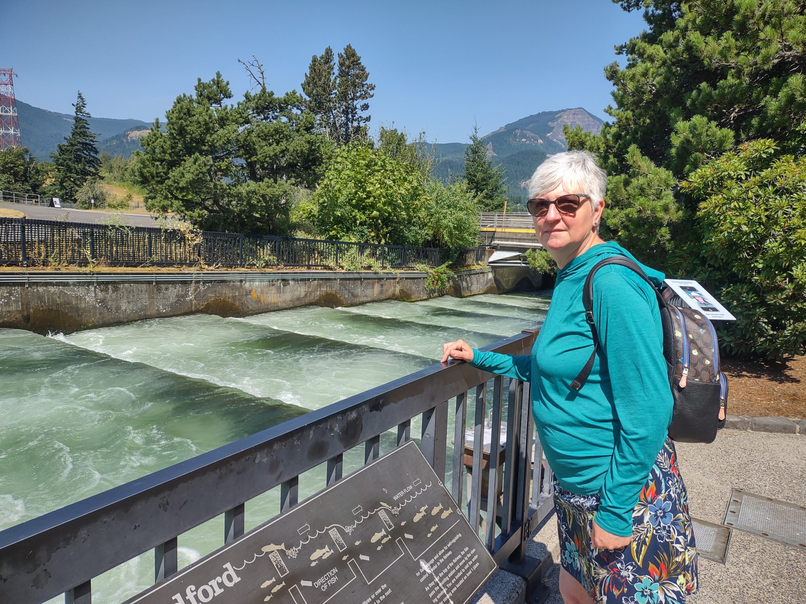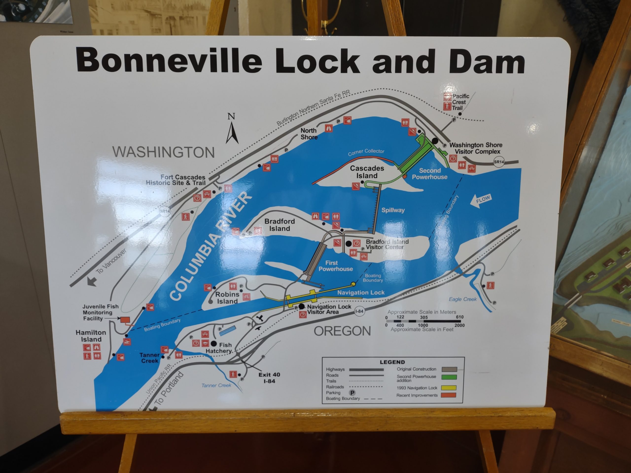 Having learned at The Dalles dam that the Bonneville dam had more access to the dam itself, we drove there to see.  On the way, we drove through Cascade Locks, where there had been a canal and lock to get around rapids, replaced by the Bonneville dam.  On arriving at the Bonneville dam, the gate guard checked our car for guns and drones, neither allowed in the area.