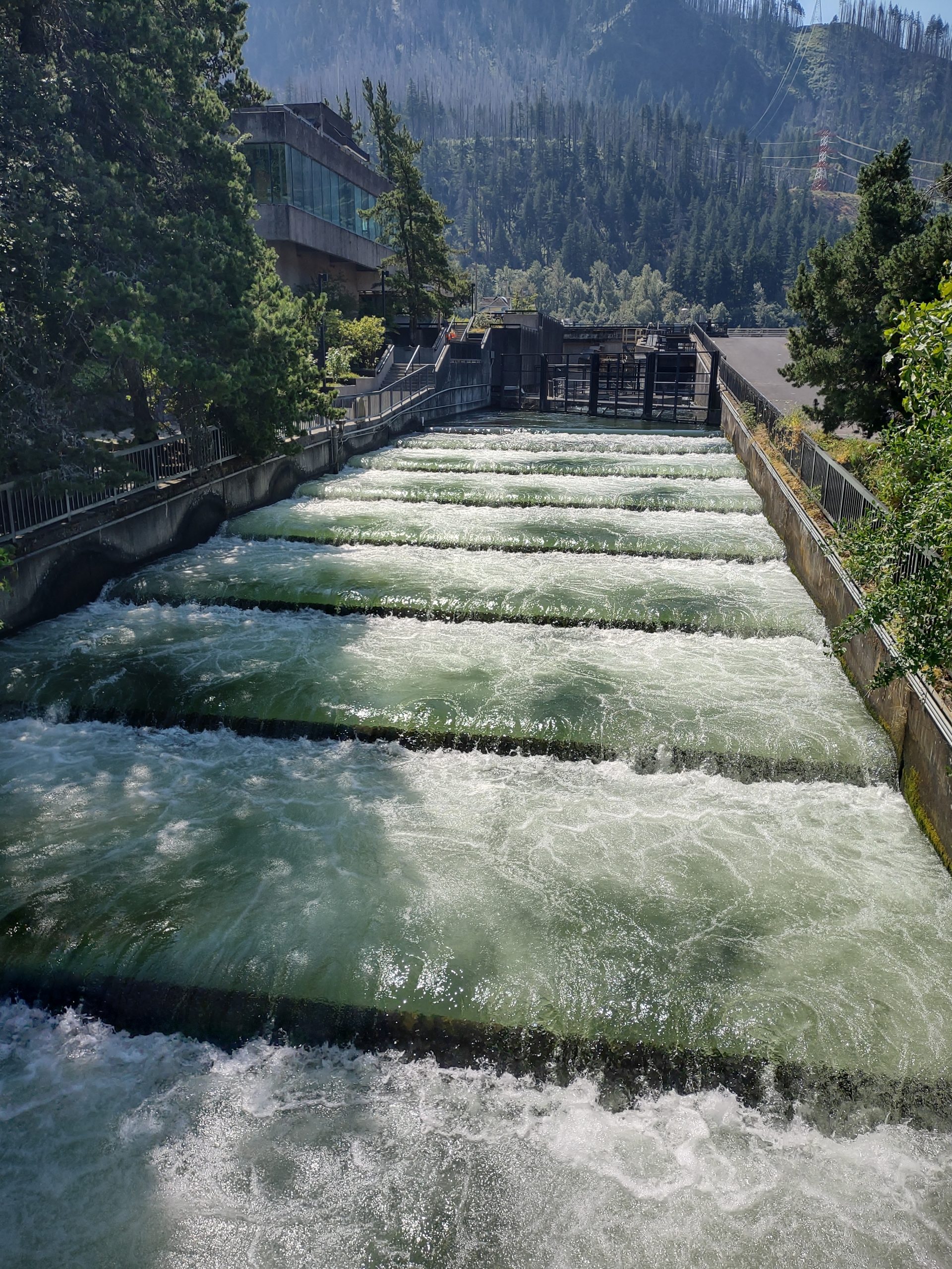 The visitor center was on five levels.  The bottom level had viewing panels for the fish ladder and the counting room.  Fish don’t have to jump each ladder; there are passages where they can simply swim up to the lakes above. In the counting room, employees literally count the number of each species of fish passing up the fish ladder.  Deadly boring to me, but I thought it might make a fantastic job for the hyper-focus sometimes accompanying autism.  There are museum-like exhibits on level four and an observation area on level five.