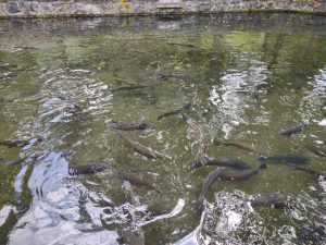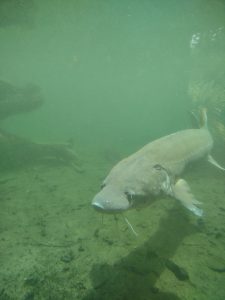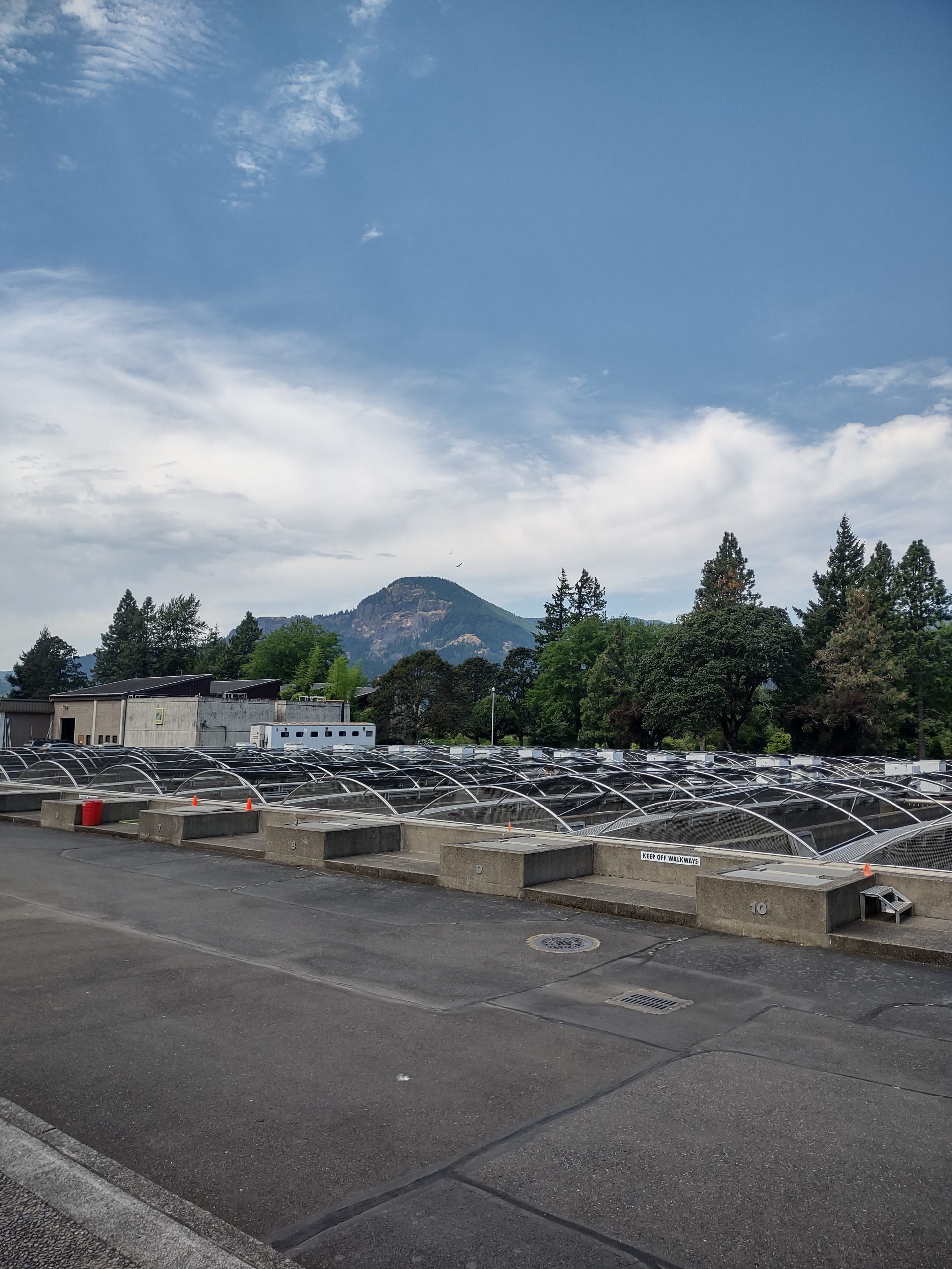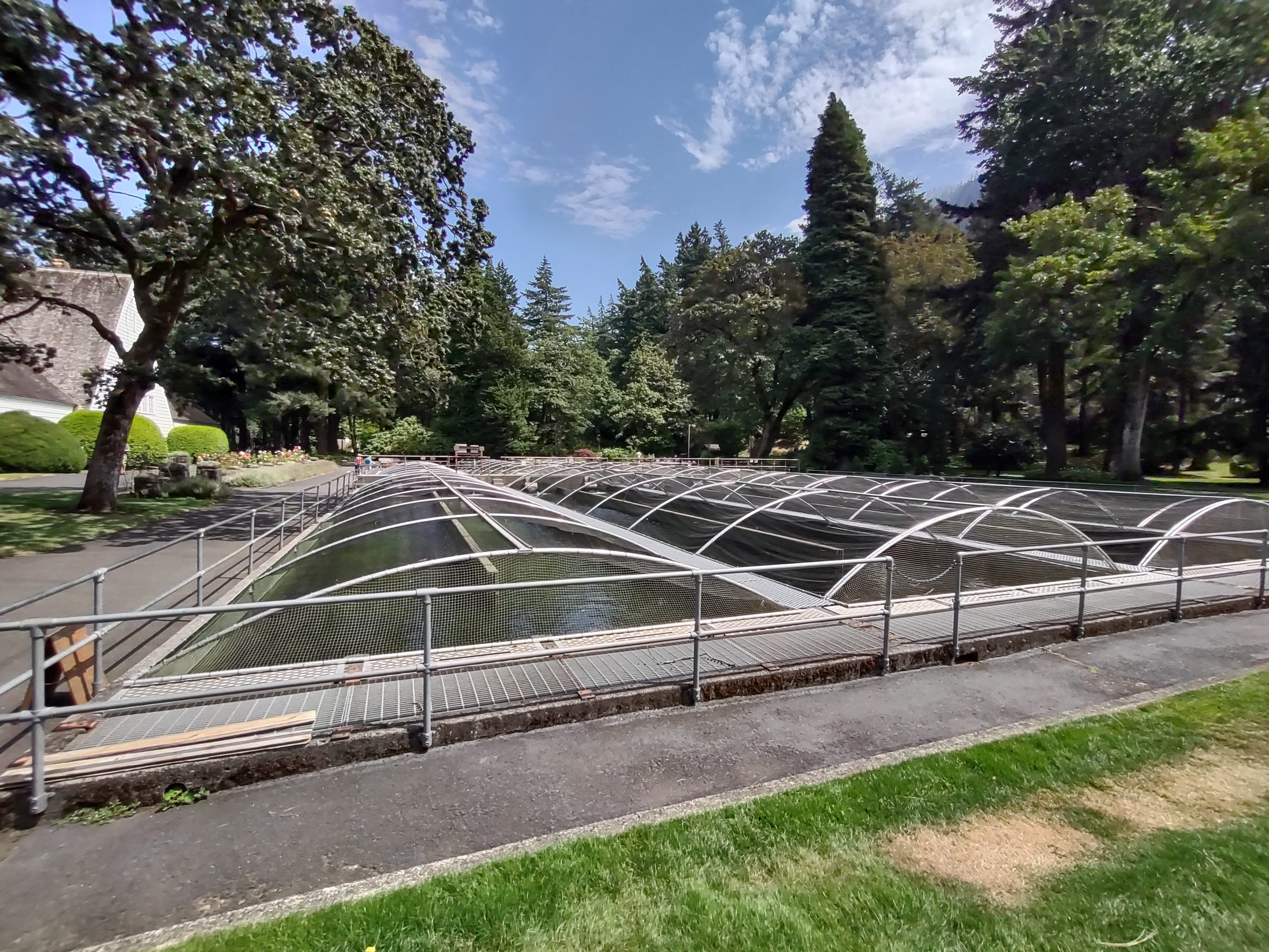 From there we drove to the fish hatchery, used to replace fish that would have been born in the areas that the dam displaces.  We saw fingerling salmon in some ponds, big rainbow trout in a viewing area and white sturgeon up to six feet long in another viewing area.  The hatchery areas where small fish are raised are covered by netting to prevent bird from eating all the fish!