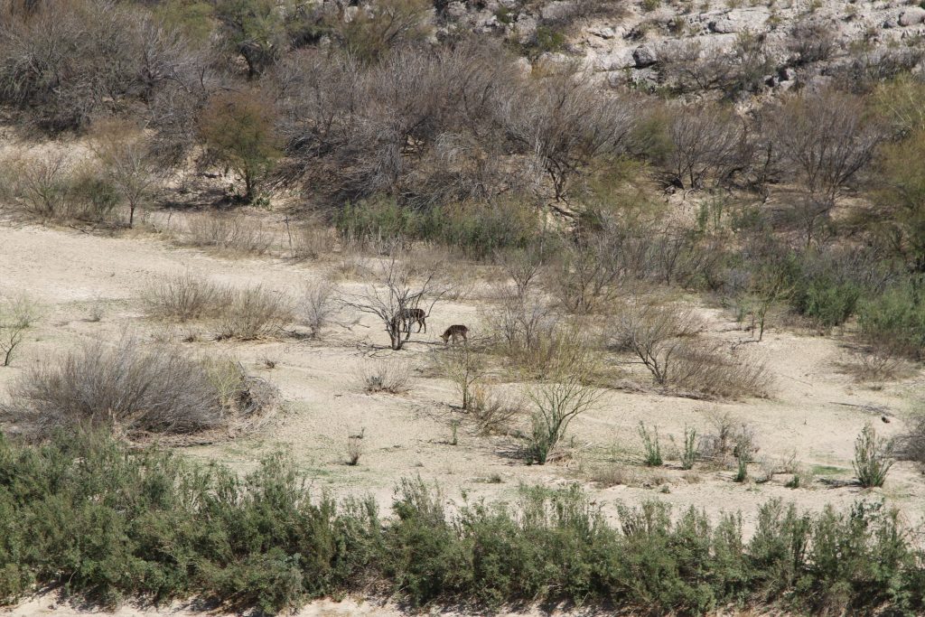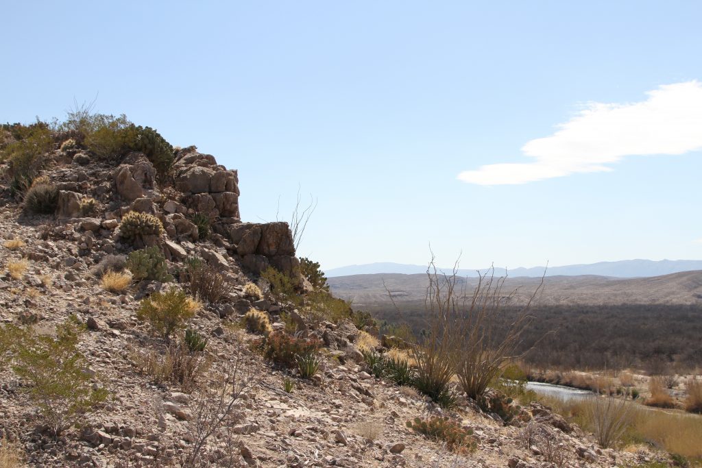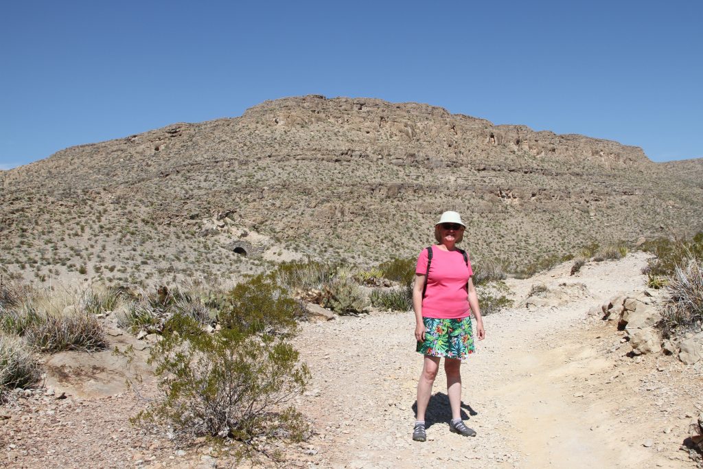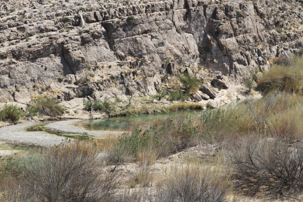 We are away from Paisano by 9am, heading to Santa Elena canyon, which was cut by the action of the Rio Grande River. Arrived at park gate at 0930 and at the canyon by 1040. Up 2000 ft, down 2000 ft over some stomach-clenching downhill grades. We hiked into the canyon about a mile, crossing the Rio Grande river at the entrance to get to the path. Up big hiking switchback, down the other side. Finally, into the shade and on the flat. Saw mama/ baby mountain goat on the way in, but they were gone on the way back. At lands end/ end of the trail, we saw canoers floating downstream. Where they were the river was so shallow their paddles touched bottom at two-foot depth. Hiked back across the switchback. Saw cave swallows on the far bank at the entrance. The wind picked up, stinging Jim’s eyes, so we got back in the RV and left. The trip back across the mountains was not as bad, as the RV was climbing instead of descending. Extremely windy at camp.