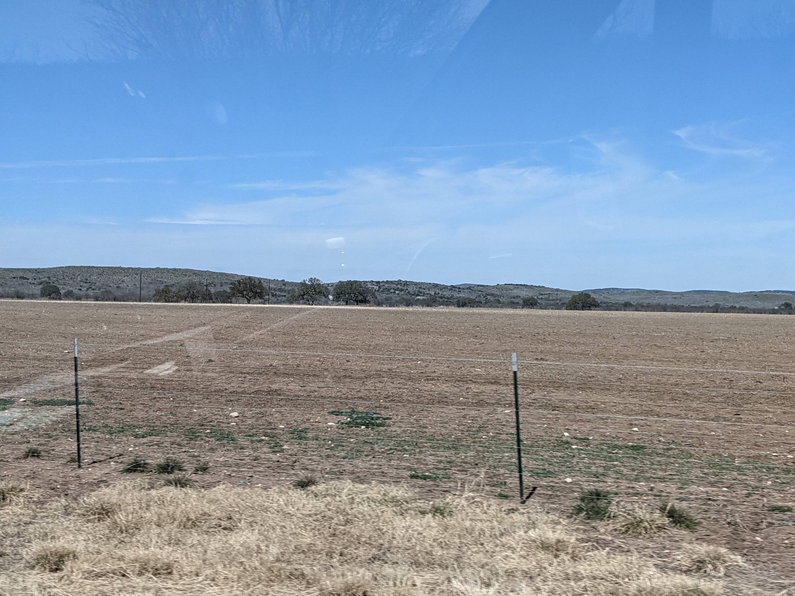 Underway at 0922 CT. Refuel at Uvalde TX, then westward. We saw the first cactus approximately 50 miles east of San Antonio. Lunch at R-BBQ (brisket) in Sabinal. Huge sandwich and tacos. I-10 through San Antonio, then 90 West. All the country is very dry, little water in the many creeks. Flat, yet the elevation is rising. We started at 100 feet elevation, San Antonio at 650 ft, Garner SP at 1000 ft. While driving, we saw “mountains” in the distance that turned out to be the hills of Hill Country which were about 700-1000 feet above the plain. Gray swaths of what we think are mesquite trees. Lots of air plants on the trees, balls that are not moss.