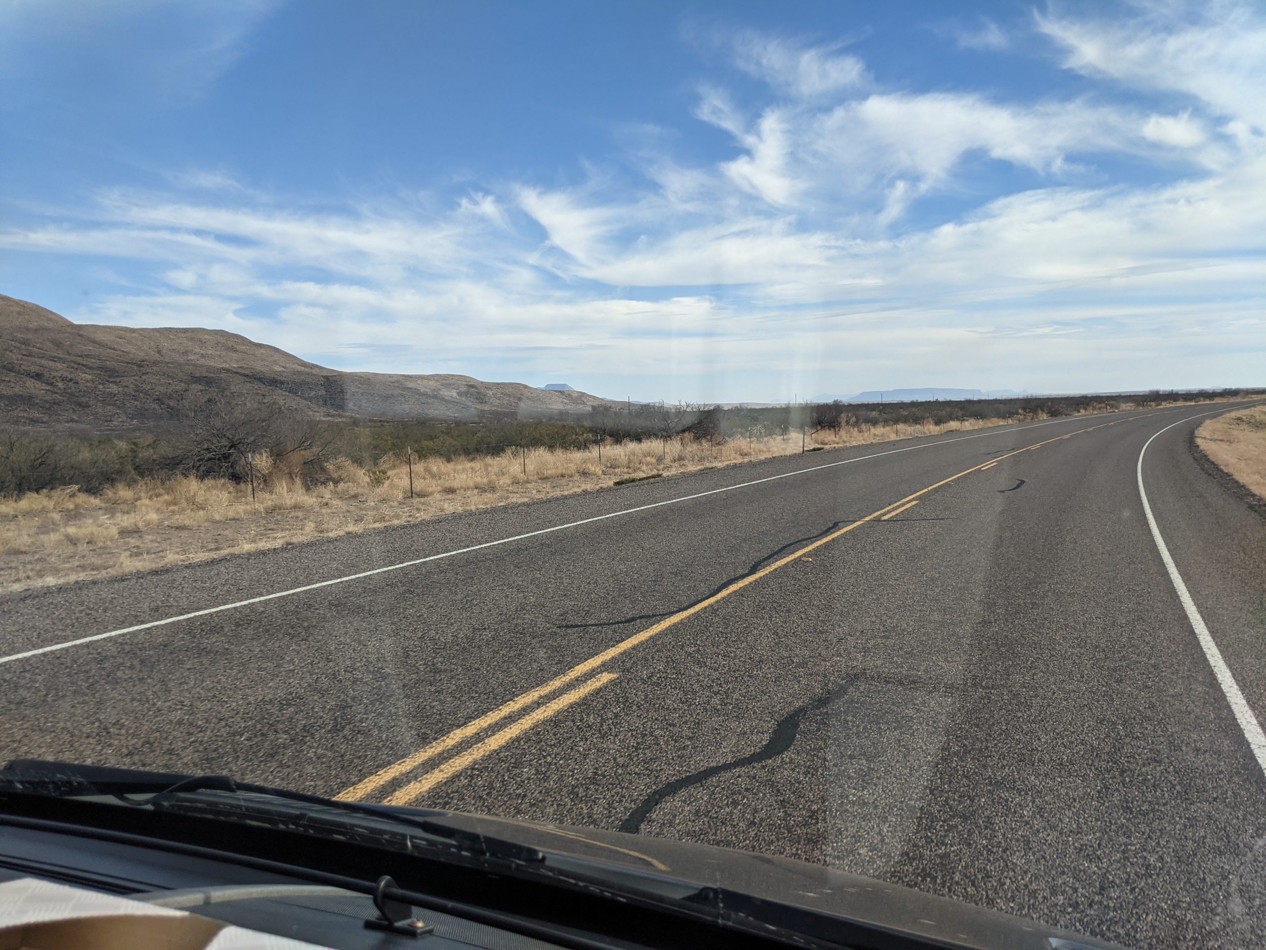 Extremely long day of driving. We left Garner SP, taking US-183 to Uvalde, then again on 90 west. We stopped at Del Rio for lunch at El Patio: Mexican food mildly/ flavorfully spiced. Got cash at the ATM and diesel. West to Langtry, a loop off 90 west where we thought there would be info on Big Bend. We didn’t find that but did drive by the Judge Roy Bean museum, though we didn’t go into the museum.