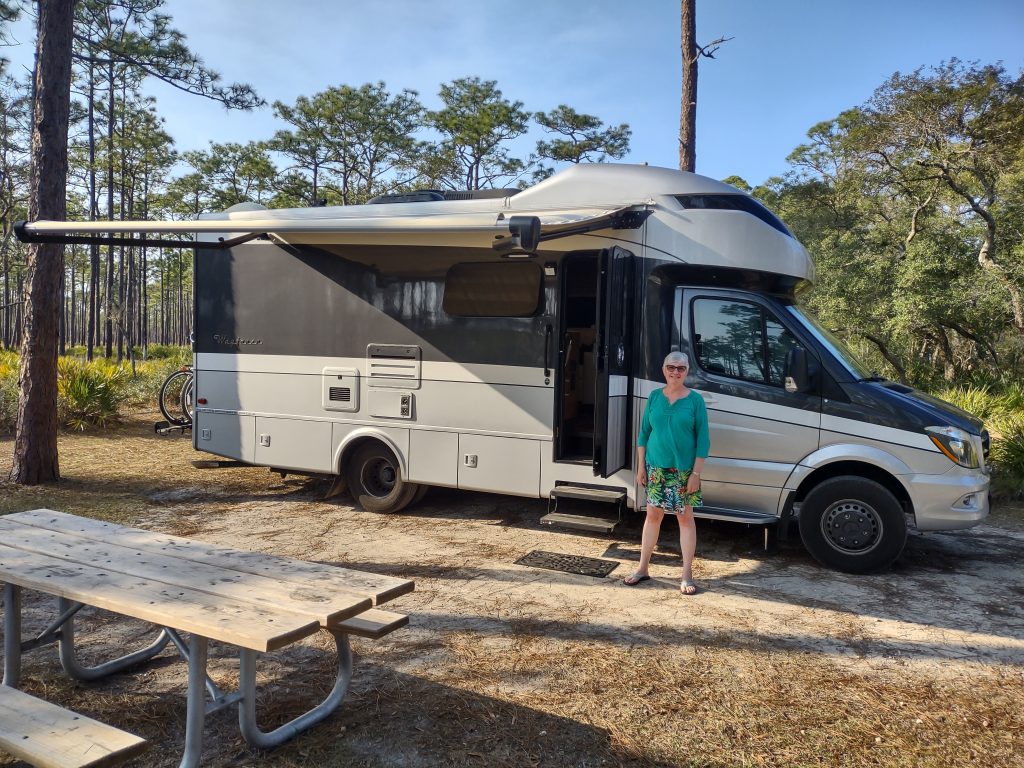 Dropped the rental car in Sanford, and then headed to Sopchoppy/ Ochlockonee SP. “O clock o knee.” Driving direction was north on I-4 to westerly roads. Much kinder than the interstate. Lots of state forest and a huge section west of Ocala that had huge horse farms. The SP is on a river in the middle of a managed forest. We took a walk, seeing white tailed deer, squirrels. Cooked chicken with satay sauce. Watched cooking shows on local PBS channel.