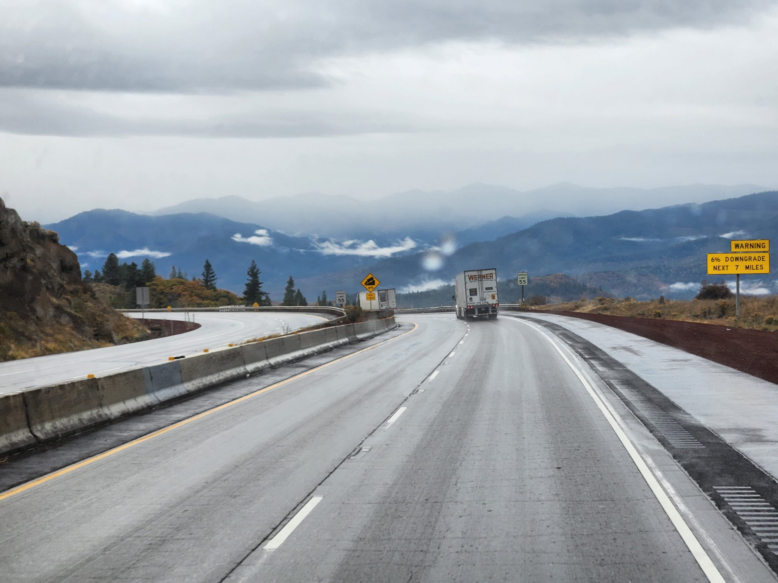 On our second day of travel, we rose about 8, and were away about 10. I-5 moved very smoothly. We traversed the very mountainous Siskiyou Summit and down to the flatlands past Mount Shasta. Rained on and off all day. The Goose performed admirably, with the engine brake and gear control making downhill grades easy to restrict. Much happier with the larger Goose than last year. Still had to slow down to 40-45 mph for the steep uphill climbs, but rock solid.
