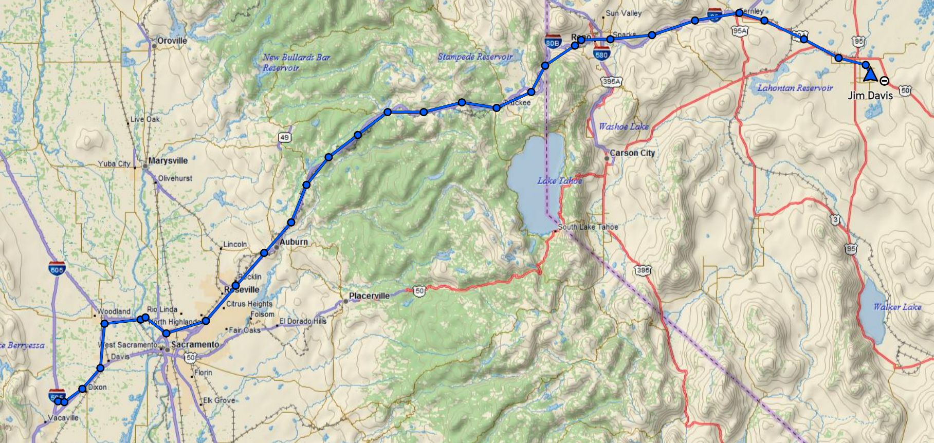 We woke about 7am, broke camp and returned the rental car to the Sacramento airport. We got onto I-80 eastbound. The Mosquito fire had expanded overnight and moved a bit northeast due to SFO Bay onshore winds. The ride uphill (to 7227 ft at Donner Pass) was very smokey. We ended up wearing N95 masks inside the Goose’s cabin, even with the AC on recirc. Steep downhill from Truckee down to Reno. We stopped for fuel in Reno, had lunch at El Pollo Loco. I used to eat at EPL all the time when in San Diego in the 90s, and the menu has changed only a very little. We headed farther east on I-80, then shifted to the roads leading to Naval Air Station (NAS) Fallon in Fallon NV.