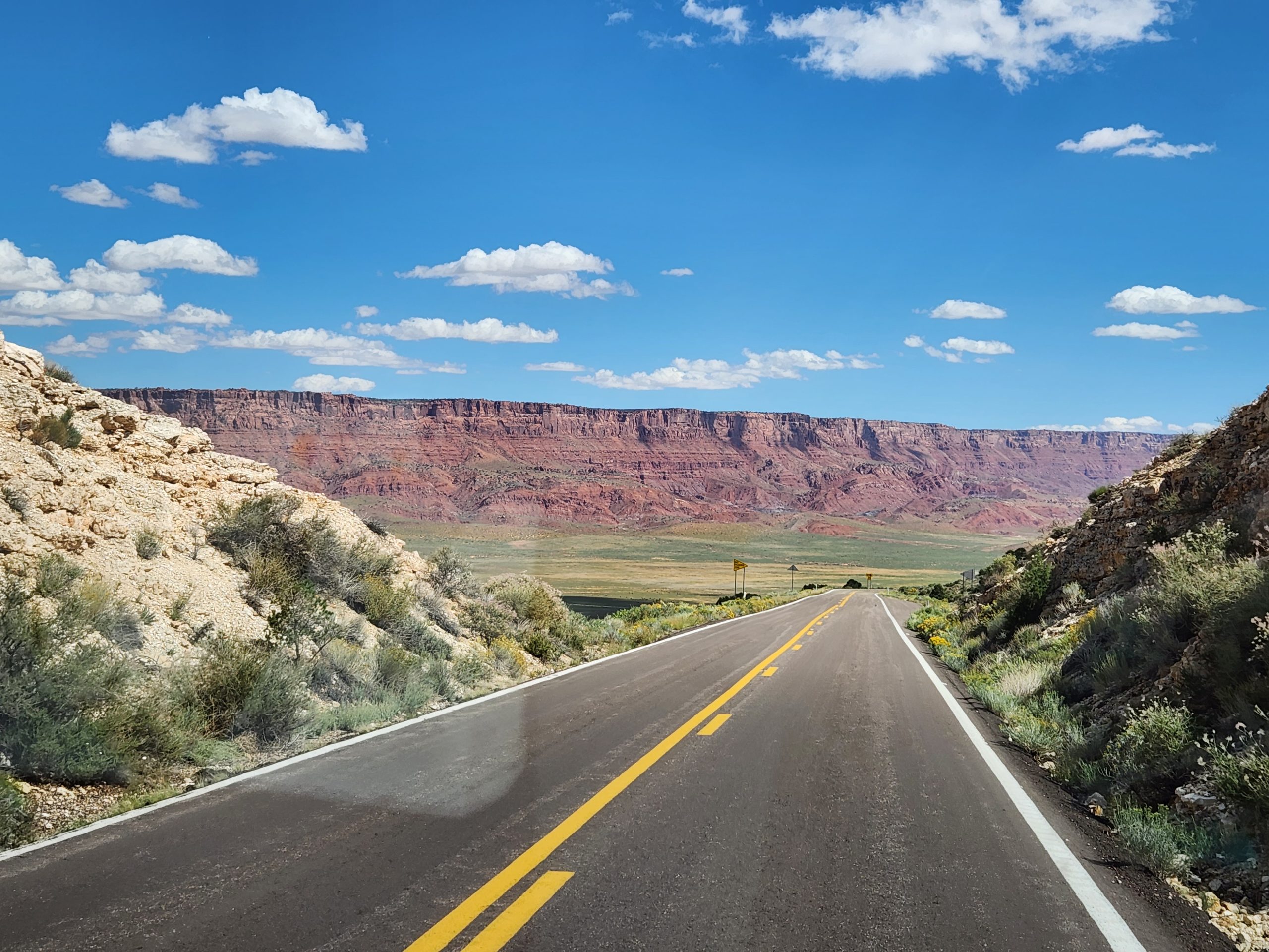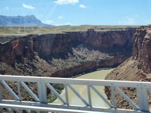 Driving down the mountain on US-89A was pretty hairy, but the scenery was gorgeous. The southern approach to the North Rim passes the Vermillion Cliffs, so called due to their color. We crossed the Colorado river at Marble Canyon, then a lot of up and down across valleys and rolling desert. We’ve seen several kinds of desert by now: brown grass; creosote bush and sage brush; Joshua trees; bare dirt/ minerals; grassy range land; and others. All depends on altitude and rainfall.