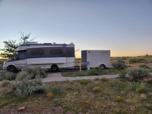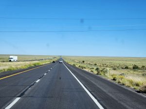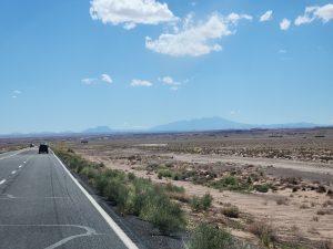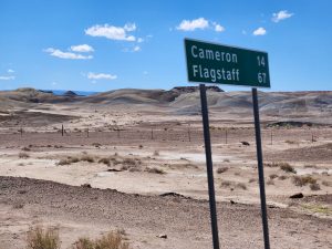 We rejoined US-89 at Bitter Springs and drove on. US-89/ 89A hold the rank of second roughest road we’ve been on, with that road in SC still leading. We climbed at Gray Mountain and at the San Francisco mountains north of Flagstaff. We joined I-40 and headed toward Winslow AZ. While traveling, Debbi arranged a camp spot at the Homolovi state park east of Winslow, where we already had a reservation for tomorrow night.