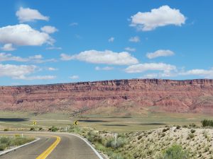We woke a little late, so scrambled to load our stuff back into the Goose from the hotel room. That includes the cases of wine we’ve collected, but couldn’t leave in the Goose due to Goose’s internal temperature without AC. Also, we don’t have suitcases, so all our clothing and other stuff were in shopping bags. Fueled the Goose and rental car and made the return to Avis. We’re feeling chary of the Goose’s engine, so crossed our fingers and started out. We traversed the Arizona Strip for the seventh time and climbed the mountains up to the Kaibab Camper Village outside of Grand Canyon NP. We arrived at noon, Arizona not keeping daylight savings time. We considered staying the night at the Village, as we did have a reservation. However, we thought we could make it to our next stop near Winslow AZ that day, so canceled the reservation and took off.