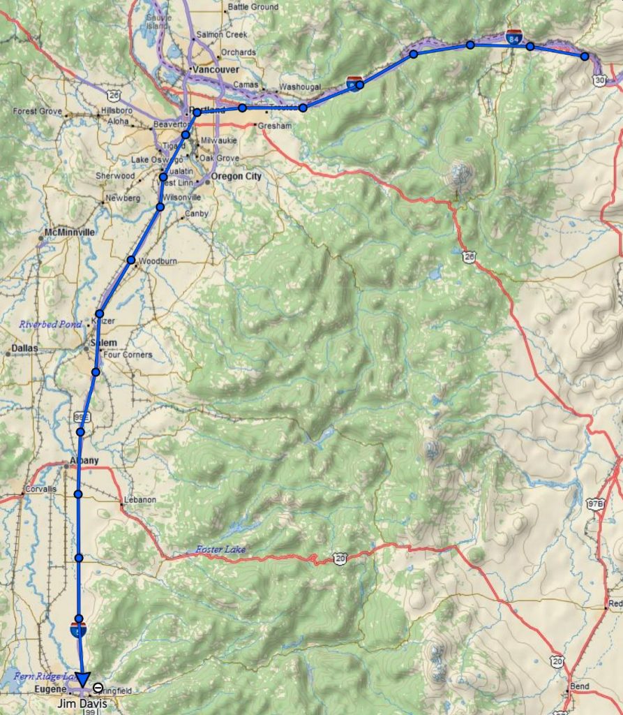 We stopped in Eugene OR on our way to Medford for the Oregon Wine Experience (see separate post). Not much to say except that the Willamette Valley is flat. It gradually comes through the vee of the Cascade mountains and coastal range. Highway miles through farming country.