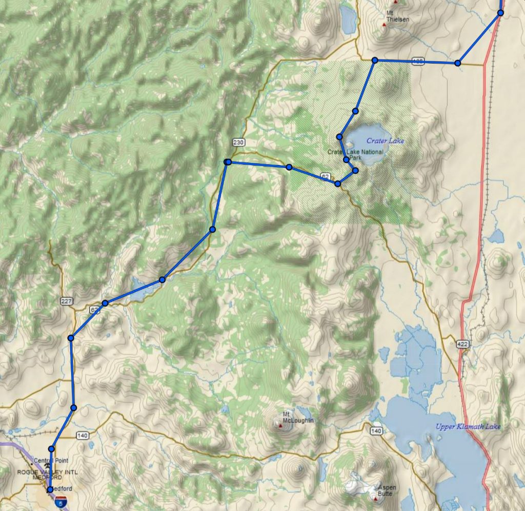 On Sept 5th, we decided to leave The Dalles a day early. There were wildfires in northern California that lay squarely on our route, and their containment was proceeding quite slowly. We plotted a route to Klamath Falls, then to Susanville CA and thence to Vacaville CA. That route swings quite wide and east around the fires.