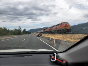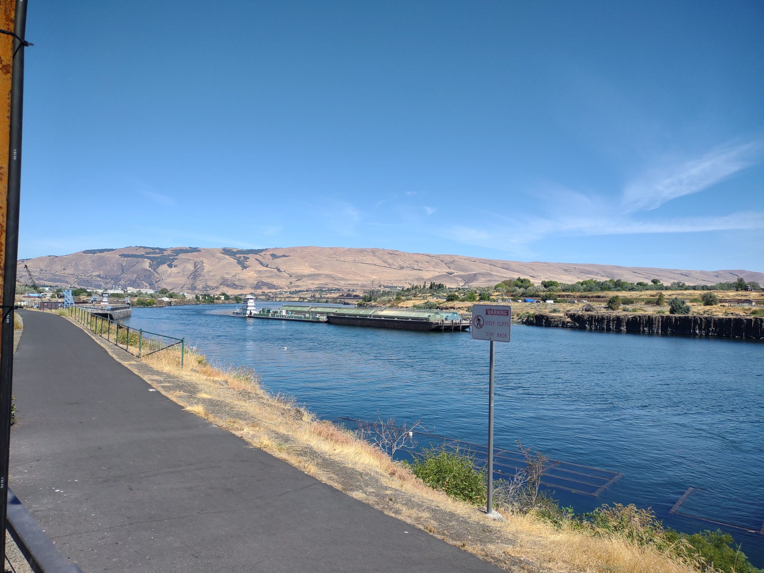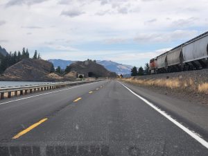 Afterward, we returned home mostly on east WA-14, passing by very big scree fields and through the towns of White Salmon and Lyle. The road has many tunnels cut through the mountains, and active railroad tracks.