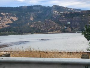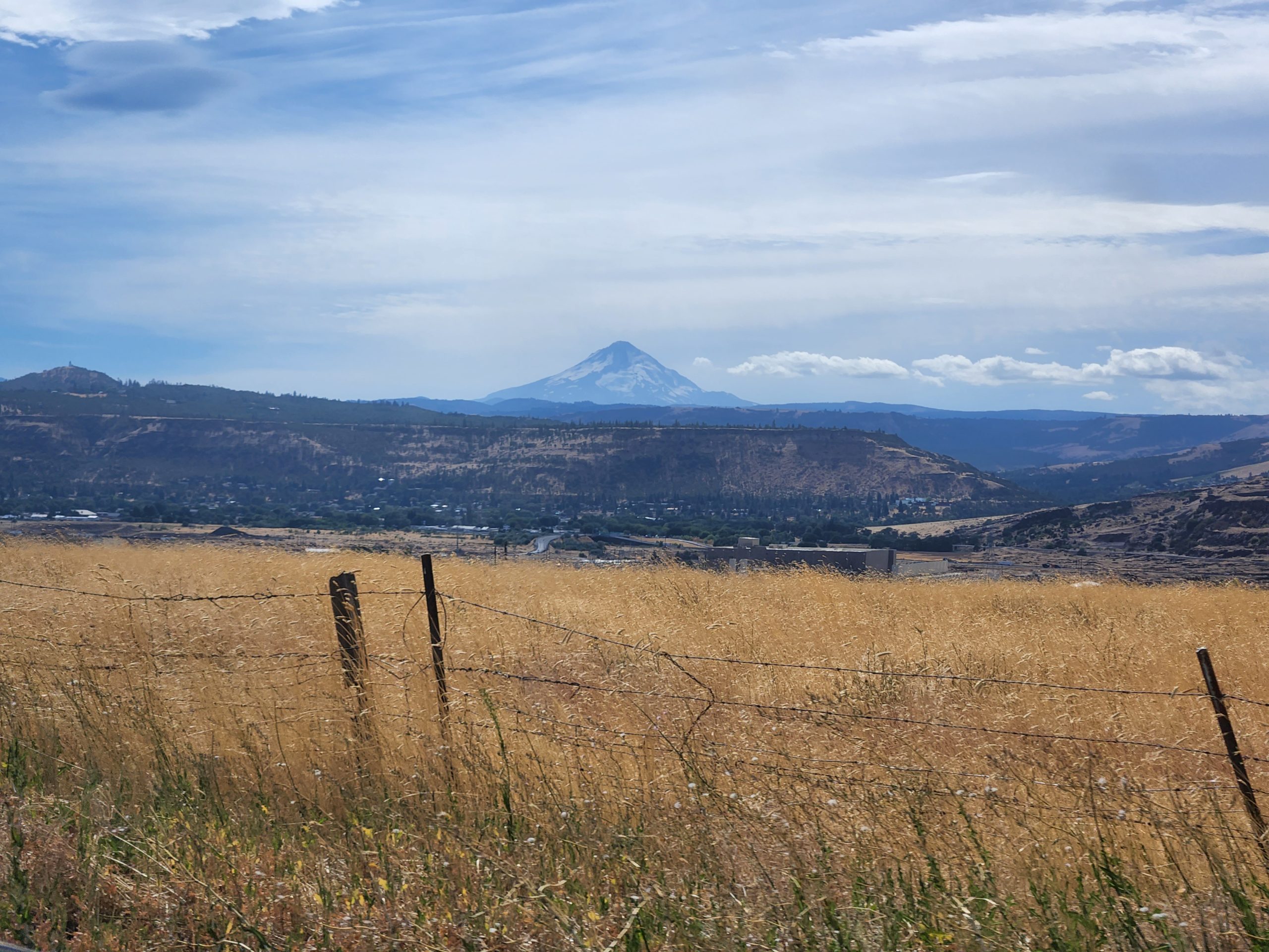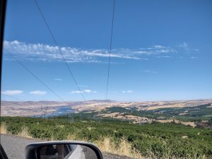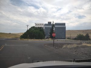 Then we wended our way back over about 15 miles of gravel road. Skyline Road is just that: high on the plateau and right at the edge of steep falloffs. I drove in the middle of the road, and even in the left lane to hug the hillside. The land had clearly been range land, shown by all the decrepit barbed wire fencing. What wasn’t fallow range land was in wheat … thousands on thousands of acres. After skinnying our way back down the road, we got back into The Dalles. Top speed on those back roads was 20 mph!