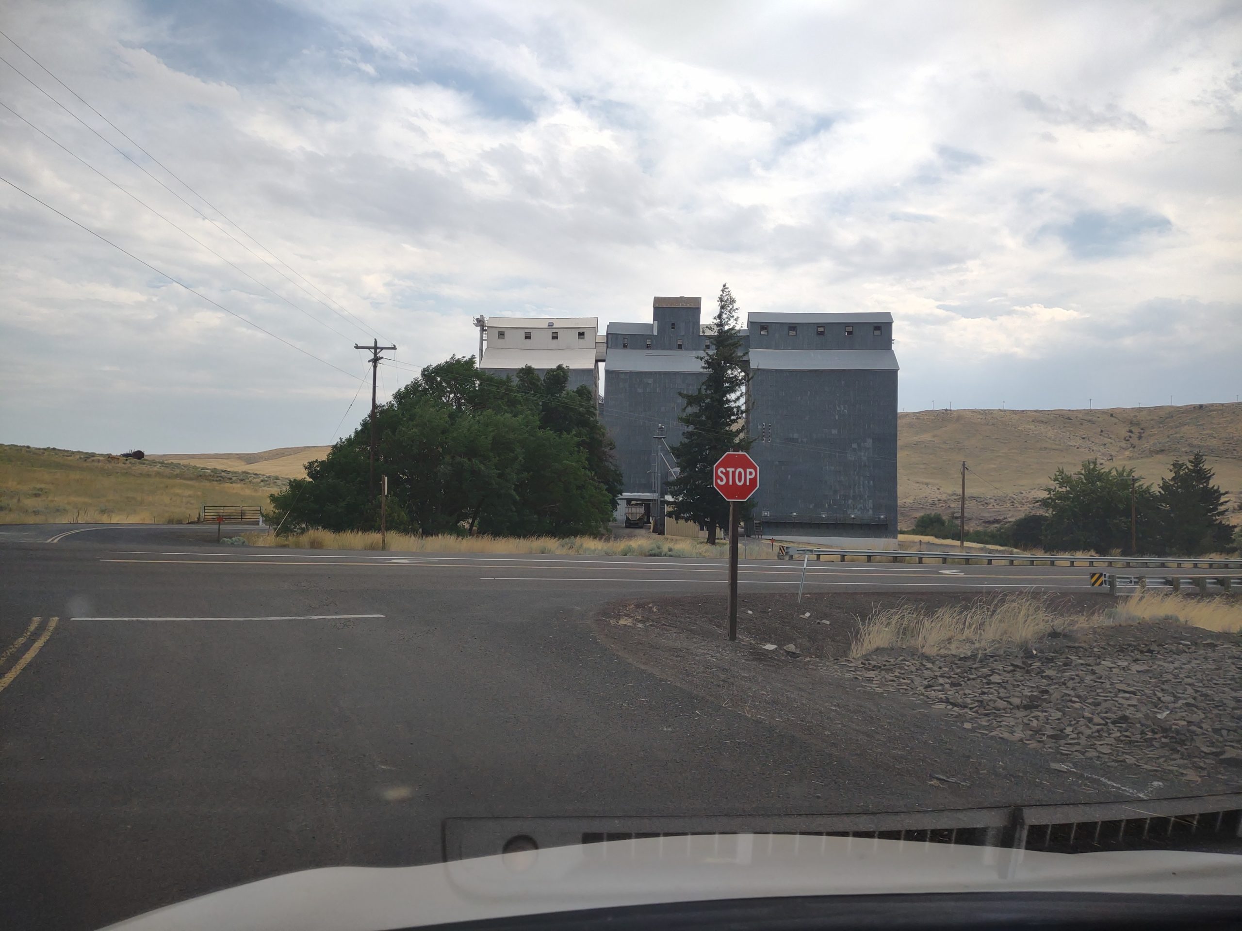 On Sunday, we decided to get out for breakfast. Had same at a place in town, then decided to see where Dry Hollow Road goes. We found it goes out through orchard (cherry mostly), then into farmland. After a while it turns to gravel. Hey, we were in a rental car, and you can do anything in those! We still had enough GPS to know where we were, so we proceeded. Turned roughly north onto Dutch Flat road. We stopped at two grain storage bins, seeing both Mt Hood (near enough) and Mt Adams (far away).