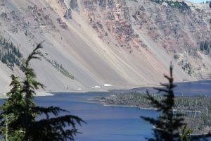 We decided to cut across Oregon on our way back to The Dalles to see Crater Lake. It’s a collapsed caldera and the deepest lake in the USA (1900 feet or so). There are no streams in or out, so evaporation is counterbalanced by snowfall, which was still on the ground in a couple of places. Like many things in Oregon, there aren’t safety fences to keep people from sliding into the lake and dying, so stand back!