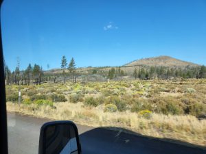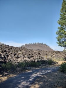 We visited the Newberry volcanic monument in mid Oregon. This is a cinder cone surrounded by a huge lava flow, all quite cold right now. We didn’t stay long, just had a quick look. It’s worth a stop if you are in mid Oregon. Next time we will take the shuttle bus to the top of the cinder cone. An interesting aspect is that no vegetation grows on the south side of the cone due to sun and wind drying things out. There are many trees on the north side.