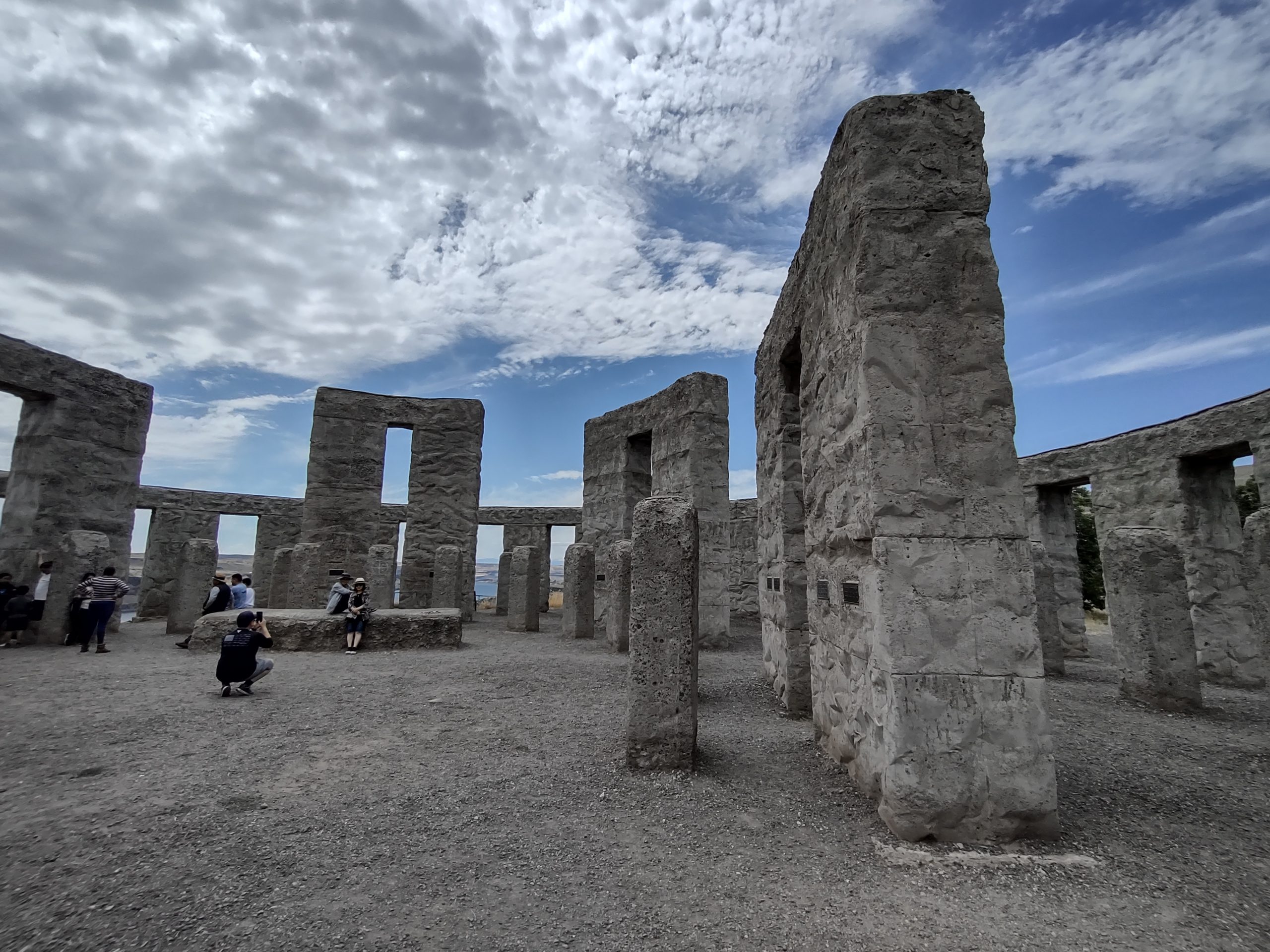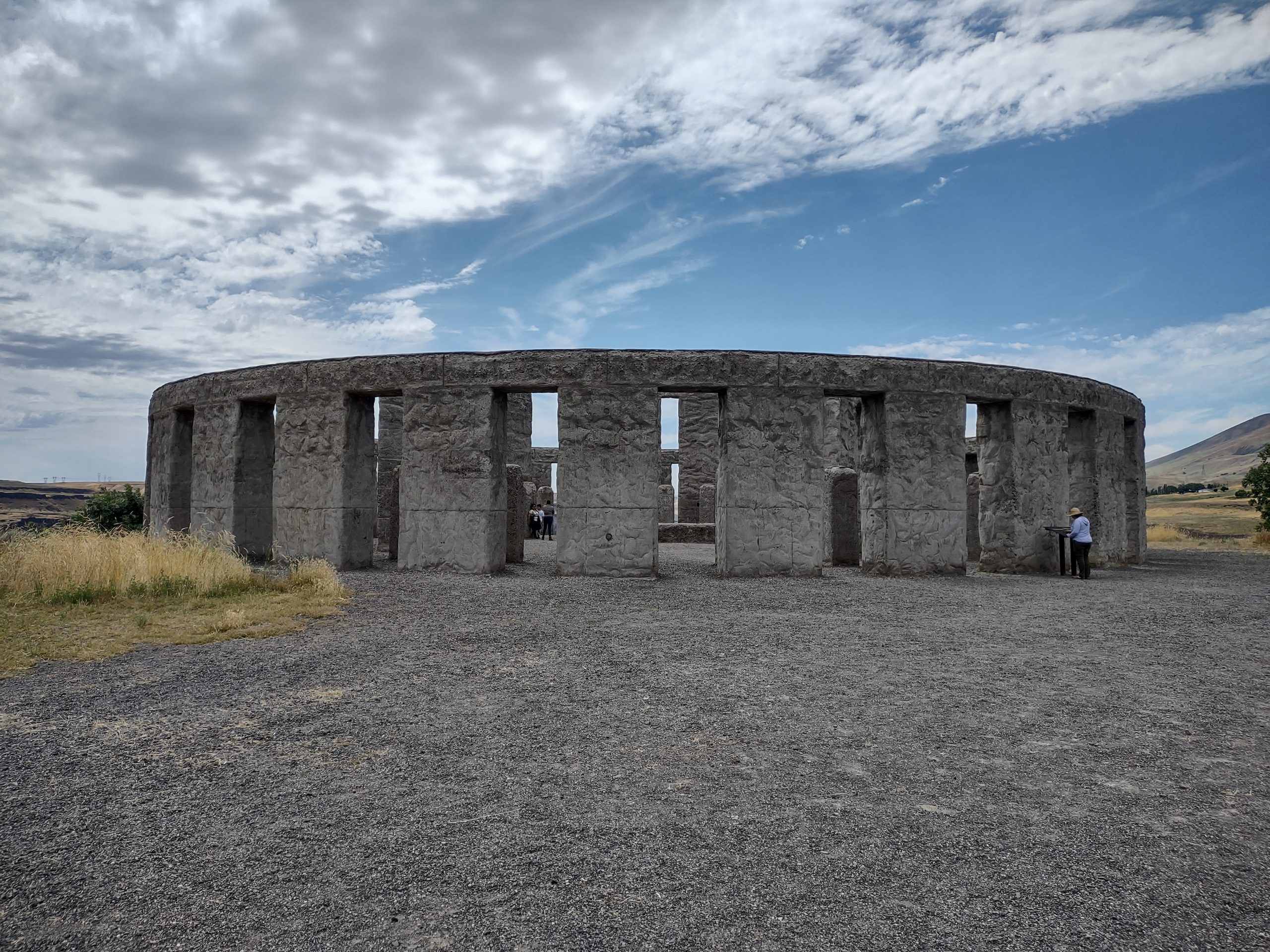 On the Washington state side of the Columbia river, there exists a memorial first dedicated to military people killed in WW1 from the area. The creator of the memorial decided to duplicate Stonehenge in its size and orientation, but complete. The memorial is not far from Maryhill winery, so we visited. It seems to be built of concrete, rather than discrete blocks. Here are some pictures: