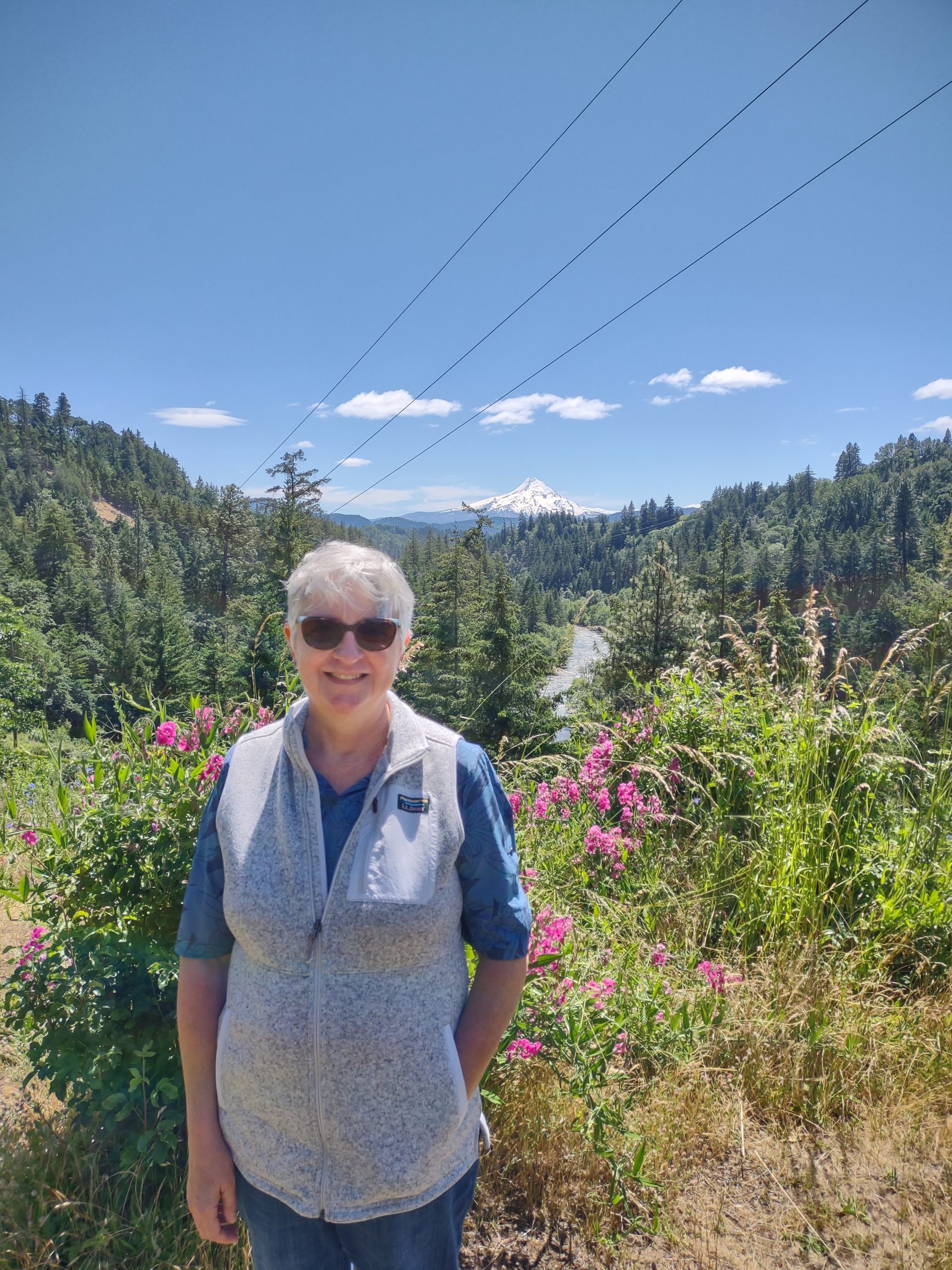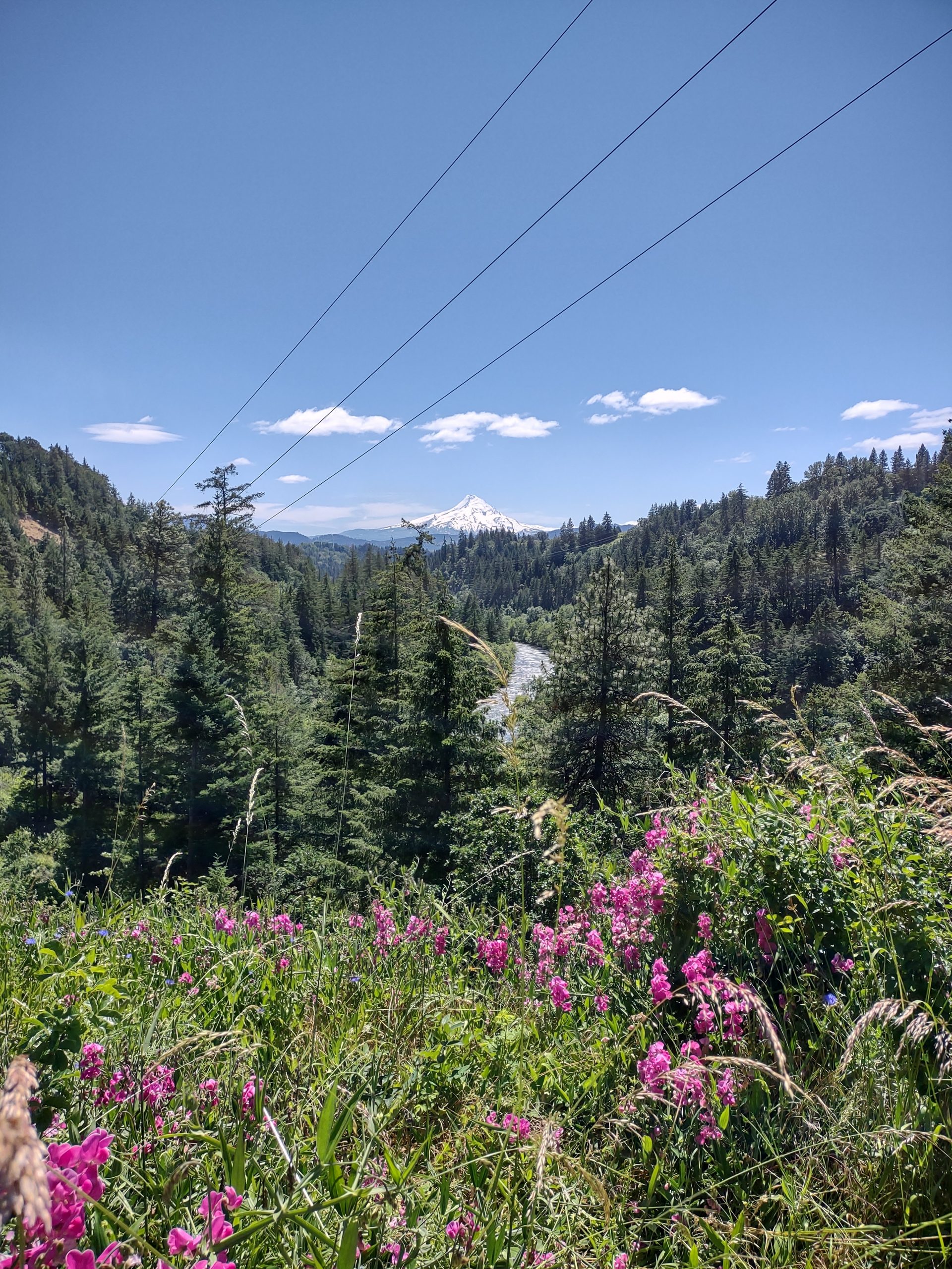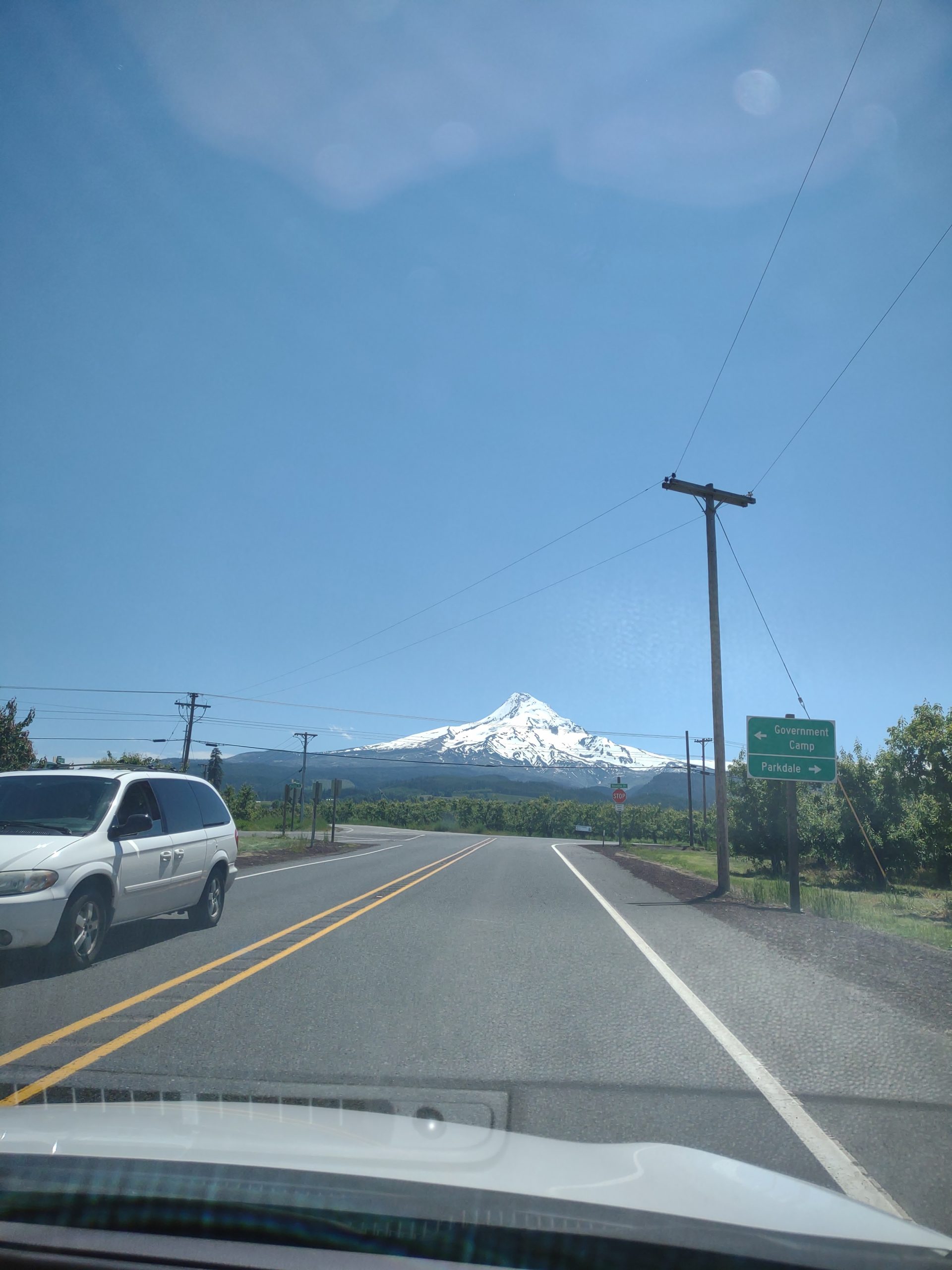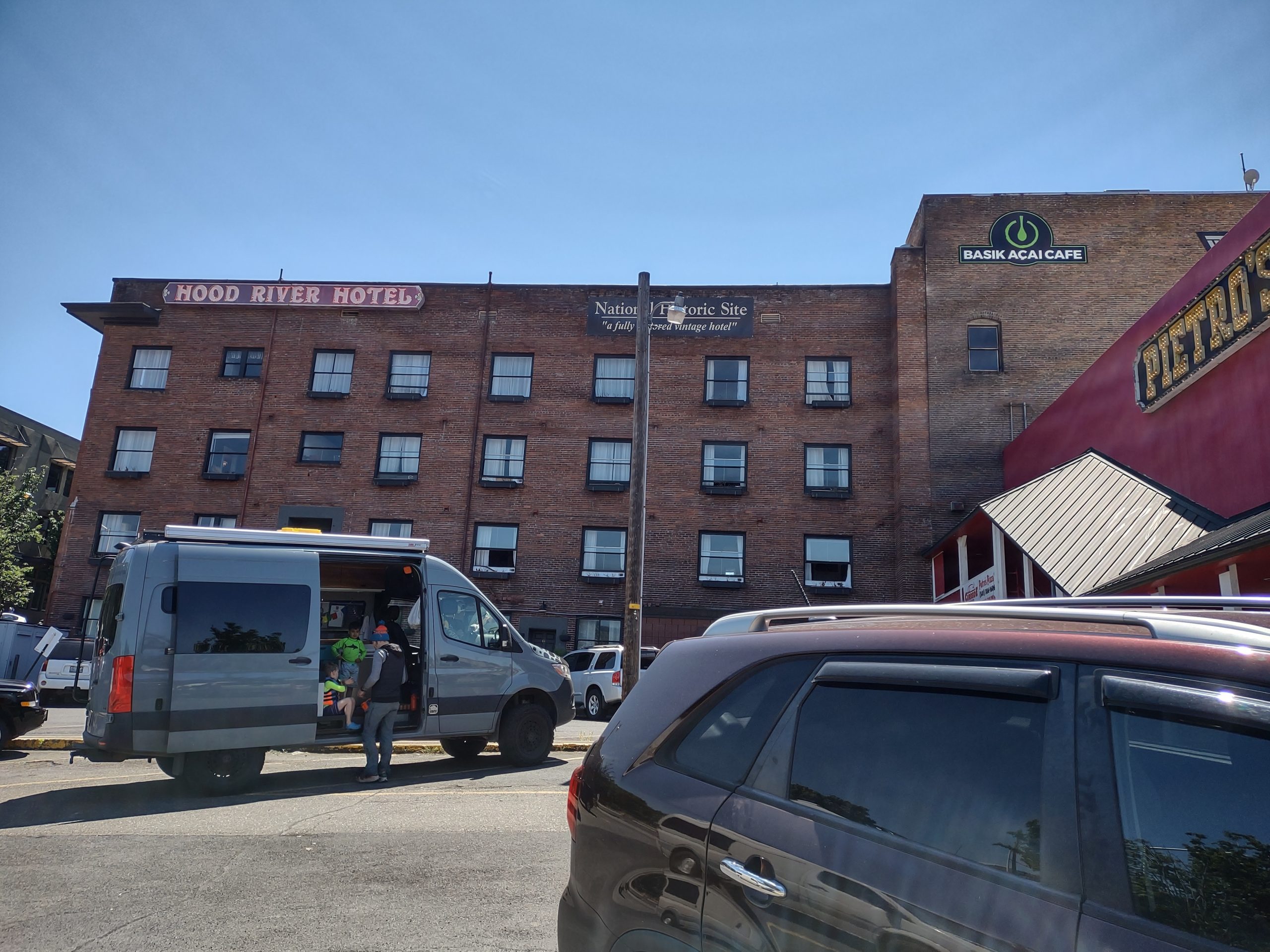Today, we drove around locally, Deb still at the wheel. We went west to Hood River and walked around a town that reminds us of Blowing Rock. Tasted some Cerulean chardonnay and pinot noir. Jim is not sure pinot noir is really a wine, but he’s willing to keep testing. Then we drove south on OR-35 to Parkdale, with gorgeous views of Mt. Hood. This road passes through fruit country: apples, pears, cherries and wine grapes. We took the Dee Highway back to Hood River, then back to The Dalles.